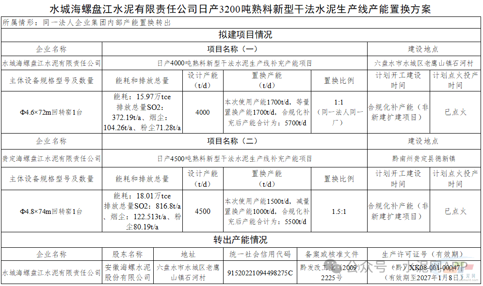 置換方案顯示,水城海螺盤江水泥退出一條3200t/d熟料生產(chǎn)線,其中1700t/d產(chǎn)能用于補充同廠區(qū)一條4000t/d熟料線,補齊后產(chǎn)能為5700t/d,置換比例1:1;