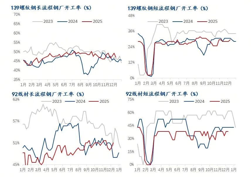 截止12月底,全國建筑鋼材鋼廠螺紋鋼和線材開工率環(huán)比均有一定下降。12月25日,螺紋鋼開工率為38.56%,較上月下降3.27個百分點,線材開工率42.44%,較上月下降6.4個百分點。分工藝來看,長流程企業(yè)螺紋鋼開工率環(huán)比下降3.65個百分點,長流程線材開工率下降6.71個百分點;短流程螺紋鋼開工率環(huán)比下降2.35個百分點,短流程線材開工率環(huán)比下降4.76個百分點。