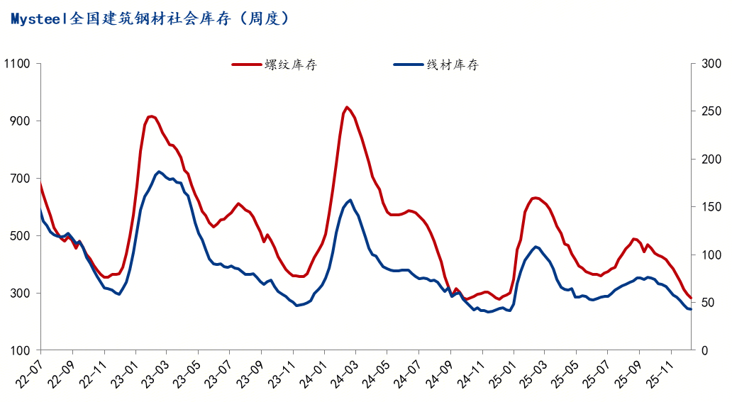 截止12月26日,統(tǒng)計螺紋鋼社會庫存294.19萬噸,月環(huán)比下降90.56萬噸,年同比增加15.98萬噸;線材庫存43.70萬噸,月環(huán)比下降14.08萬噸,年同比下降0.26萬噸。